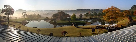 Early-morning view: mist lifting over lakes and fairways.